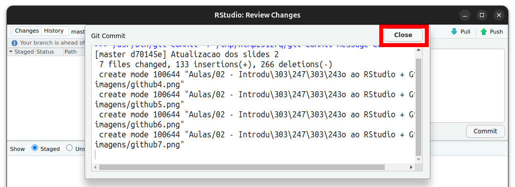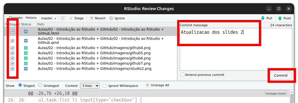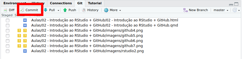 via RStudio mostra os arquivos que foram alterados. Selecione-os.