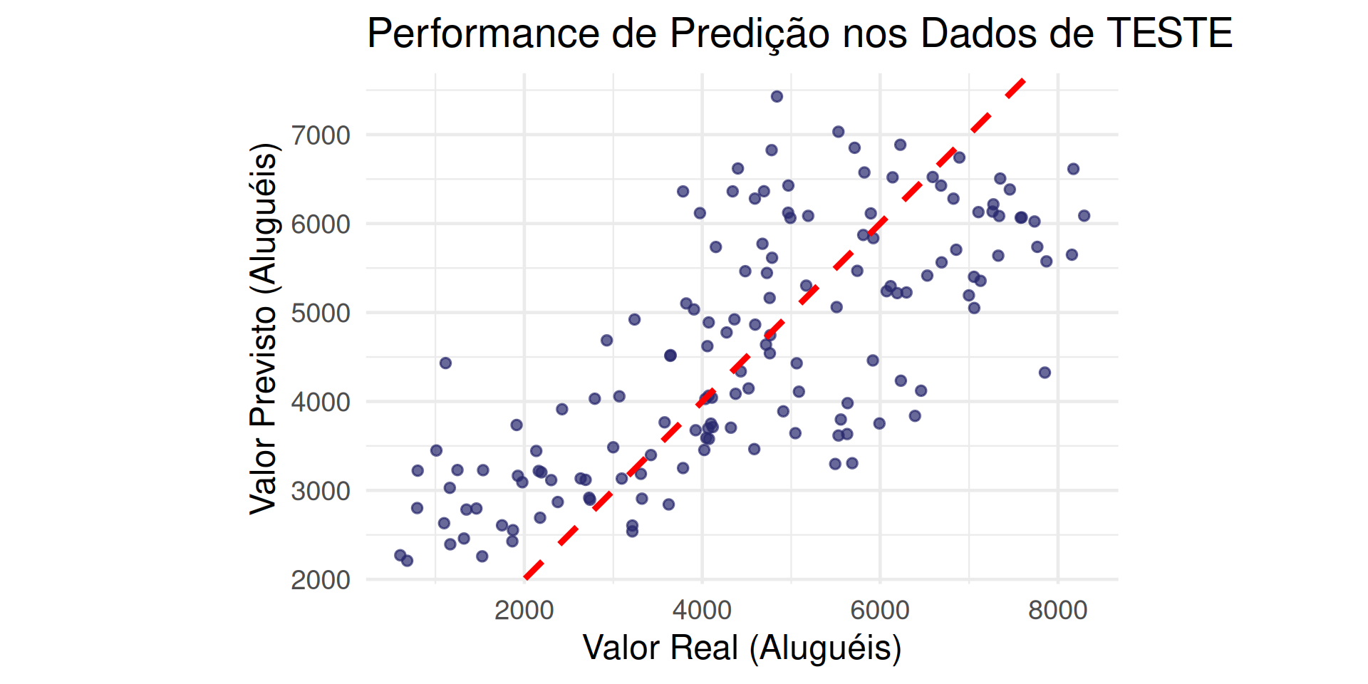 ggplot(resultados_teste, aes(x = rentals, y = .pred)) +geom_point(color ="#27276d", alpha =0.7, size =2) +# A linha de predição perfeita (y=x)geom_abline(color ="red", linetype ="dashed", linewidth =1.5) +labs(title ="Performance de Predição nos Dados de TESTE",x ="Valor Real (Aluguéis)",y ="Valor Previsto (Aluguéis)" ) +theme_minimal(base_size =18) +# Força os eixos a terem a mesma escala para uma comparação justacoord_fixed()