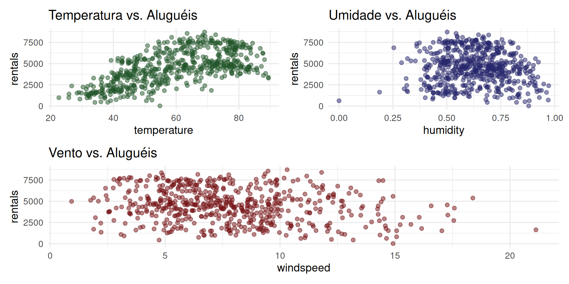 # Seus gráficos originais, agora aplicados aos dados de TREINOp1 <-ggplot(bikes_treino, aes(x = temperature, y = rentals)) +geom_point(color ="#22562a", size =2, alpha = .5) +theme_minimal(base_size =14) +labs(title ="Temperatura vs. Aluguéis")p2 <-ggplot(bikes_treino, aes(x = humidity, y = rentals)) +geom_point(color ="#27276d", size =2, alpha = .5) +theme_minimal(base_size =14) +labs(title ="Umidade vs. Aluguéis")p3 <-ggplot(bikes_treino, aes(x = windspeed, y = rentals)) +geom_point(color ="#741012", size =2, alpha = .5) +theme_minimal(base_size =14) +labs(title ="Vento vs. Aluguéis")(p1 + p2) / p3