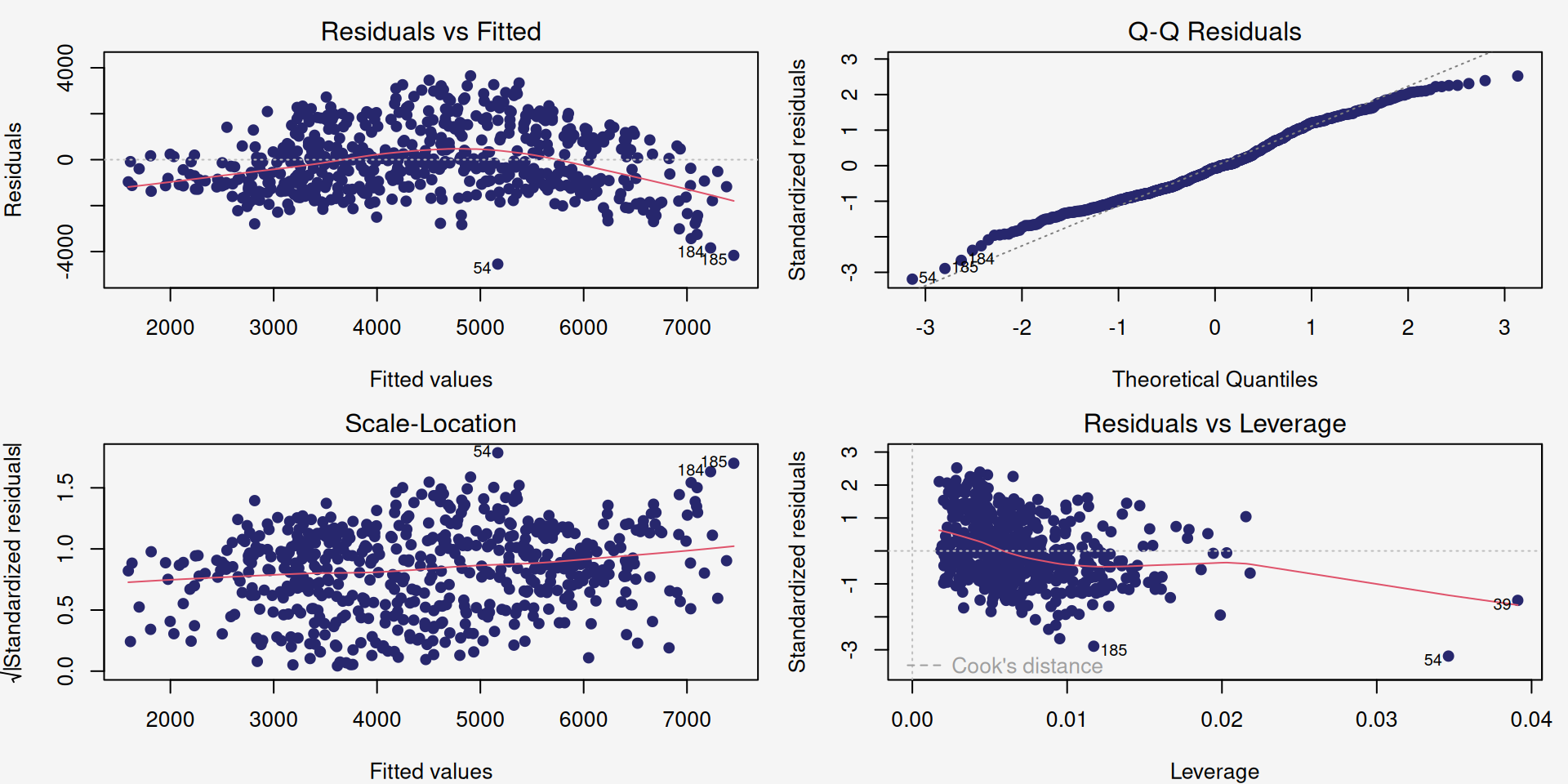 # Gráficos de diagnóstico do R basepar(mfrow =c(2, 2), bg ="#F5F5F5", mar =c(4, 4, 2, 1))plot(modelo, pch =20, col ="#27276d", cex =1.5)